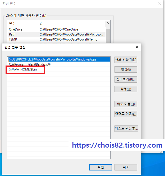 추가한 JAVA_HOME 변수를 path를 선택한 후, '편집' 버튼을 눌러서 %JAVA_HOME%bin을 추가합니다.