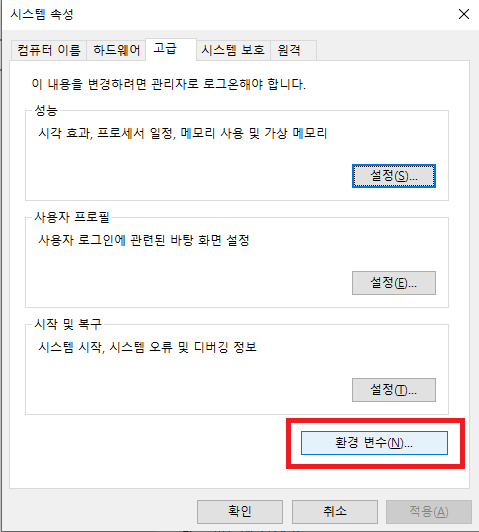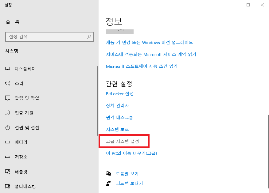 내컴퓨터 - 마우스 오른쪽 버튼 - 속성(R) 클릭 [단축키 윈도우 + Pause] 입력 후 아래 이미지 순서대로 진행