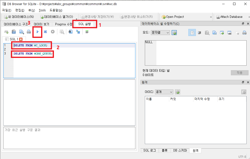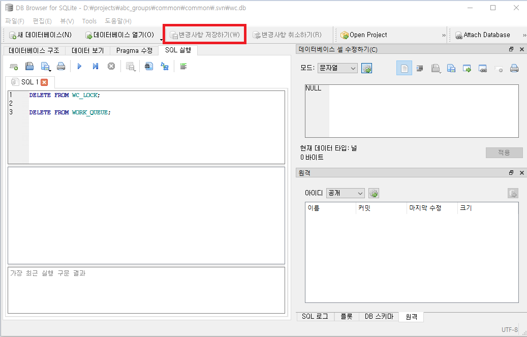 - SQL 실행 탭을 눌러 에디터에 DELETE FROM WC_LOCK, DELETE FROM WORK_QUEUE 문을 각각 실행합니다.