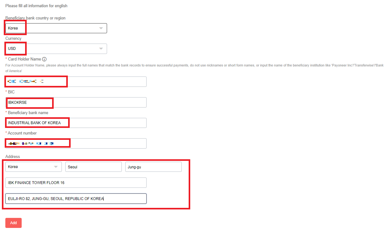 BIC, Beneficiary bank name, Address 정보를 정확하게 입력해주시면 됩니다.